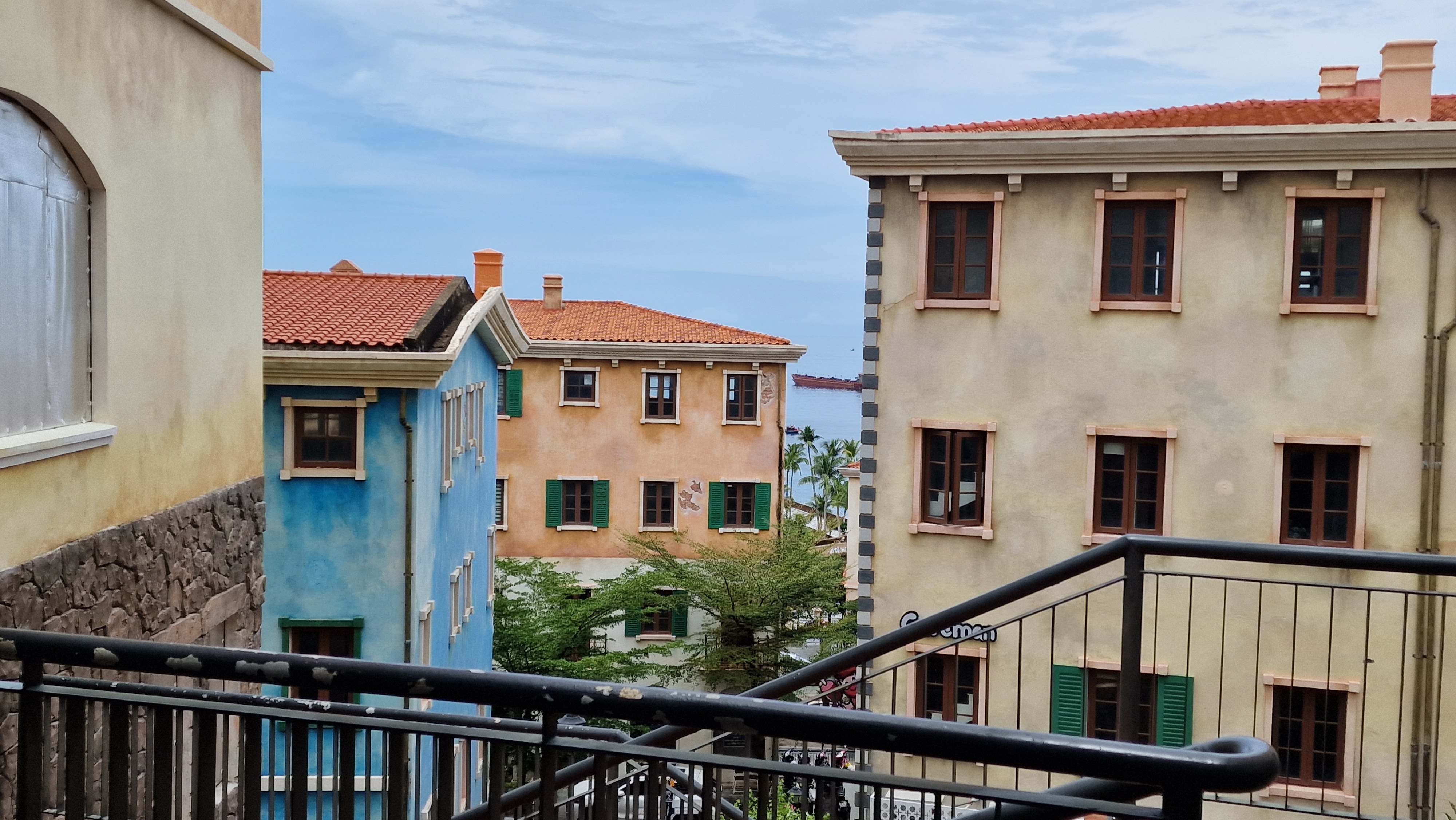 This utterly bizarre vision from another world also carries a strange story, but that will be told later- first I’ll explain truly how unusual this place is. As if a complete textbook replica of the Amalfi Coast wasn’t enough, the true twist in Sunset Town’s tale comes when you actually look a little deeper. Its streets are almost entirely devoid of people- there’s a small hive of activity at the harbour where tourist boat trips set off, but otherwise you could be walking for five minutes and not see anyone else. I find it shocking that a project of this scale can be so deserted- not just of inhabitants. As soon as you go two streets back from the sea, nearly all the buildings are empty, to the point where they don’t have flooring, lights or stairs yet, let alone a business to operate within them. The eeriest part of this particular aspect is that there are quite literally fake shop fronts stuck to windows, which can’t even be truly imagined until you see the picture below.